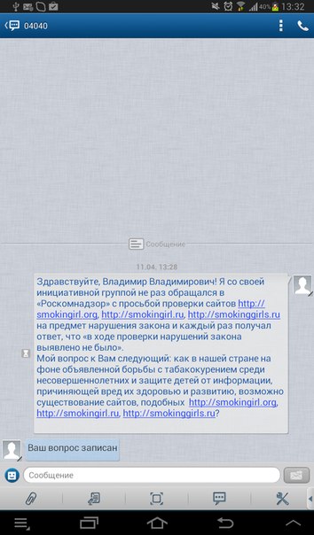 Сегодня я проявил активную гражданскую позицию и задал вопрос господину Путину о его отношении к «дыре» в антитабачном законодательстве, благодаря которой успешно существуют сайты, подобные смолинскому. Пусть о его сайтах узнает государство! Друзья, предлагаю каждому из вас написать данное обращение президенту! Курение не должно безнаказанно рекламироваться в интернете!